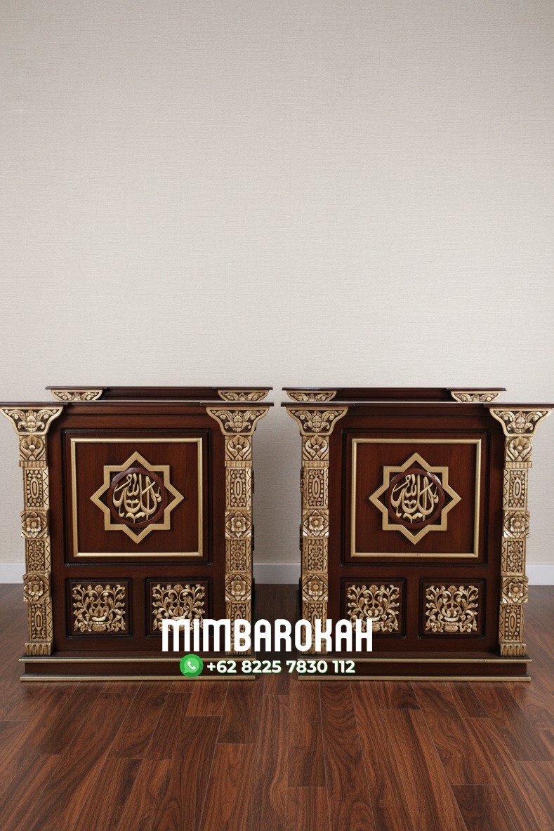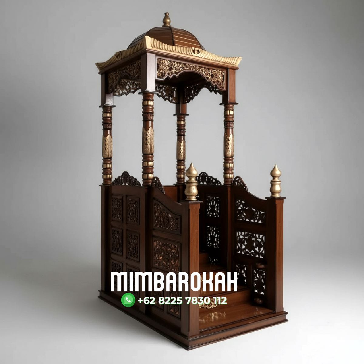 Mimbar atap kubah yang banyak di pesan adalah Mimbar Sesuai Sunnah kaligrafi arabic lafadz Syahadah, Podium Mimbar Tumbang Titi ini diproduksi langsung tukang mebel jepara asli yang memiliki pengalaman dalam pembuatan mimbar podium, Untuk menghasilkan hasil yg mewah maka mulai dari proses kontruksi mimbar podium masjid minimalis yang ber atap kubah emas maupun tidak dikontrol secara langsung oleh orang-orang yg sudah dibidangnya.