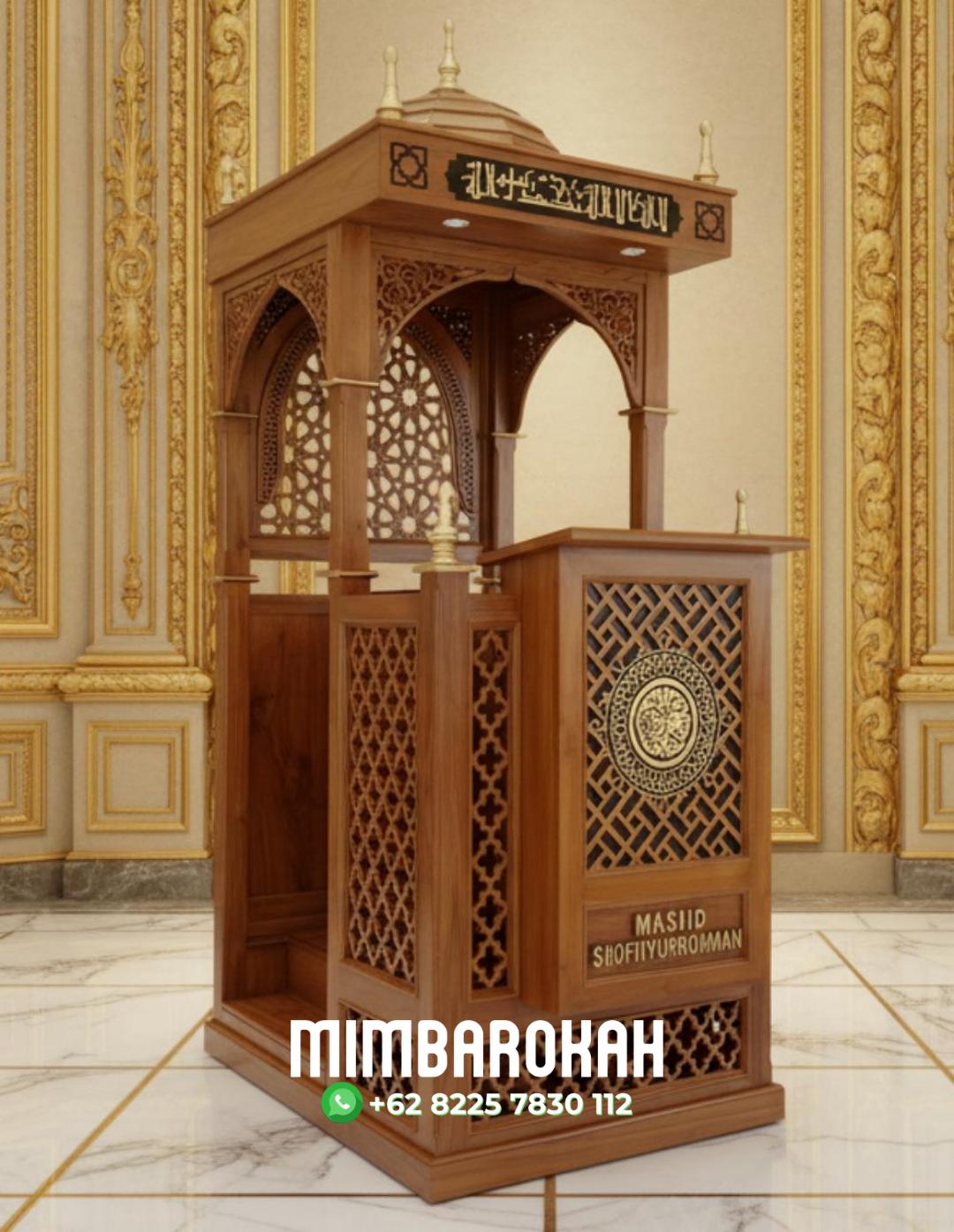 Note : Kami sangat senang jika Anda meng-custom warna/ornamen Mimbar Podium Ukiran Jepara dengan nama masjid, almamater maupun majlis ta’lim.